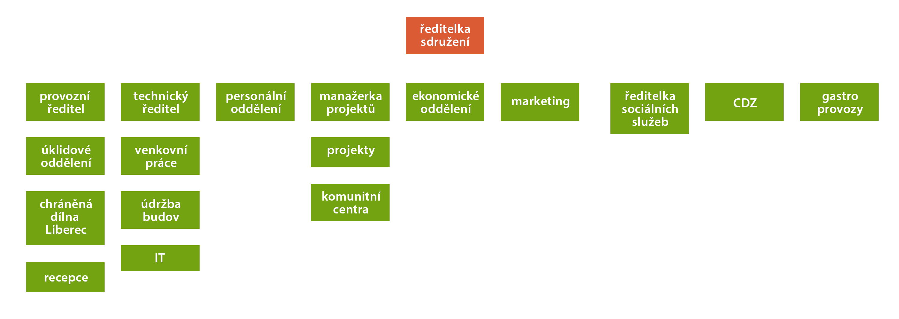 Od managementu až po recepci. Níže se můžete podívat na podrobnou organizační strukturu našeho sdružení.