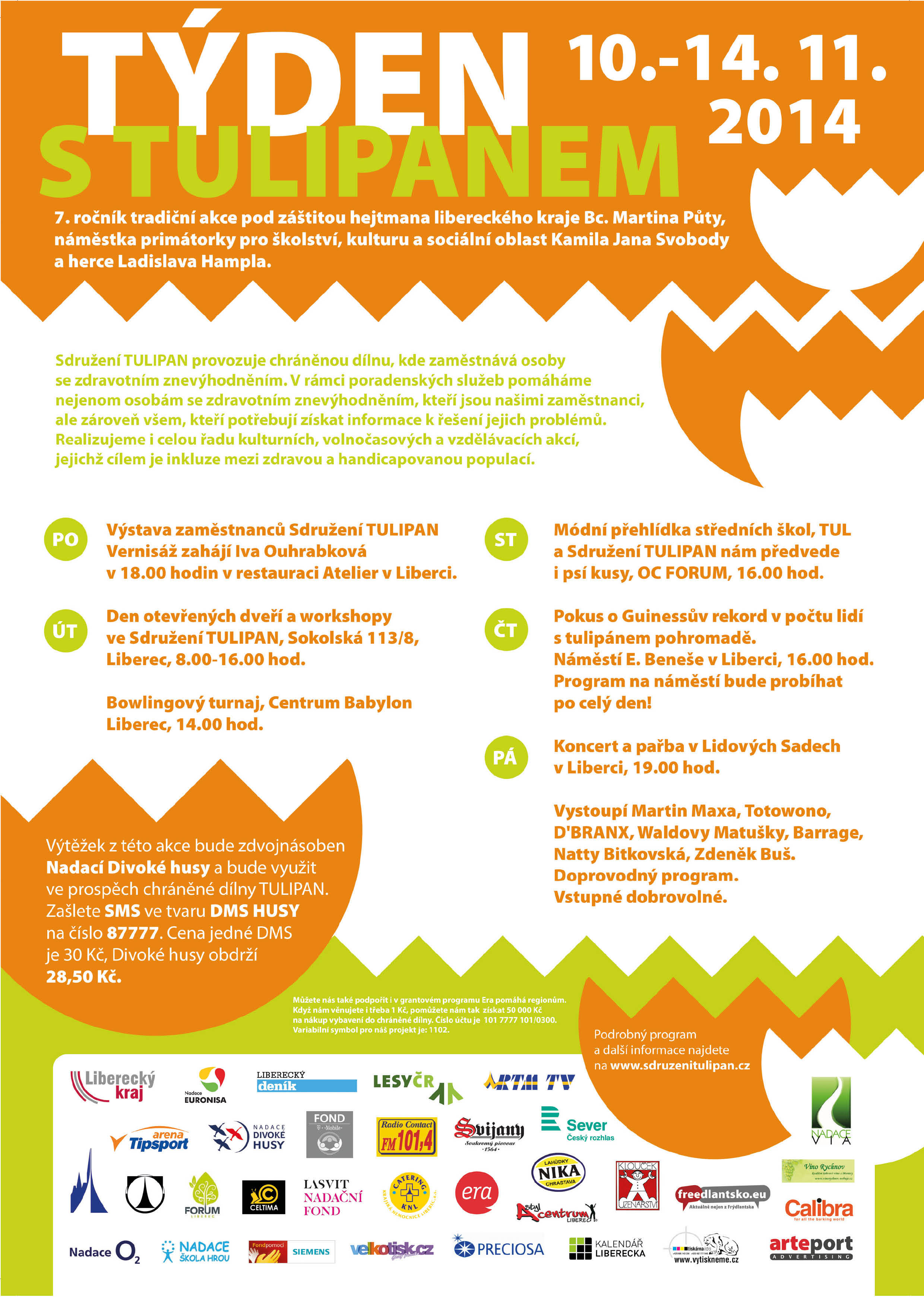 Každoroční akce pro širokou veřejnost Letošní rok v listopadu proběhl sedmý ročník tradiční akce Týden s TULIPANem 2014. V rámci tohoto týdne proběhla řada zajímavých akcí. Počínaje vernisáží obrazů, sportovním kláním, módní přehlídkou. Ve čtvrtek 13.11.2014 se nám podařilo uskutečnit pokus o Guinnessův rekord v největším počtu lidí s tulipánem na náměstí Dr.E.Beneše. V pátek byla celá akce ukončena benefičním koncertem, kde vystoupilo několik regionálních kapel v čele s Martinem Maxou. Nad akcí převzal záštitu hejtman Libereckého kraje Bc. Martin Půta, náměstek Liberce Kamil Jan Svoboda a známý herec Ladislav Hampl.