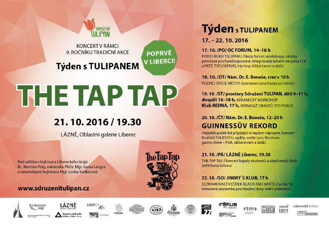 Tradiční podzimní kulturně-společenský festival okořeněný unikátním pokusem o světový rekord pořádá v Liberci tento týden Sdružení TULIPAN. Týden s TULIPANEM začíná v pondělí 17. října v OC Forum školou focení a workshopy. Zlatým hřebem se stane koncert populární kapely studentů a absolventů Jedličkova ústavu The Tap Tap v Galerii Lázně, která vystoupí v Liberci vůbec poprvé. Letošní devátý ročník Týdnu s TULIPANEM pokračuje v loňském trendu představování mladých umělců a alternativní scény z Liberecka. Tím zároveň navazuje na další oblíbenou akci TULIPANU - letní hudební TULIFEST.