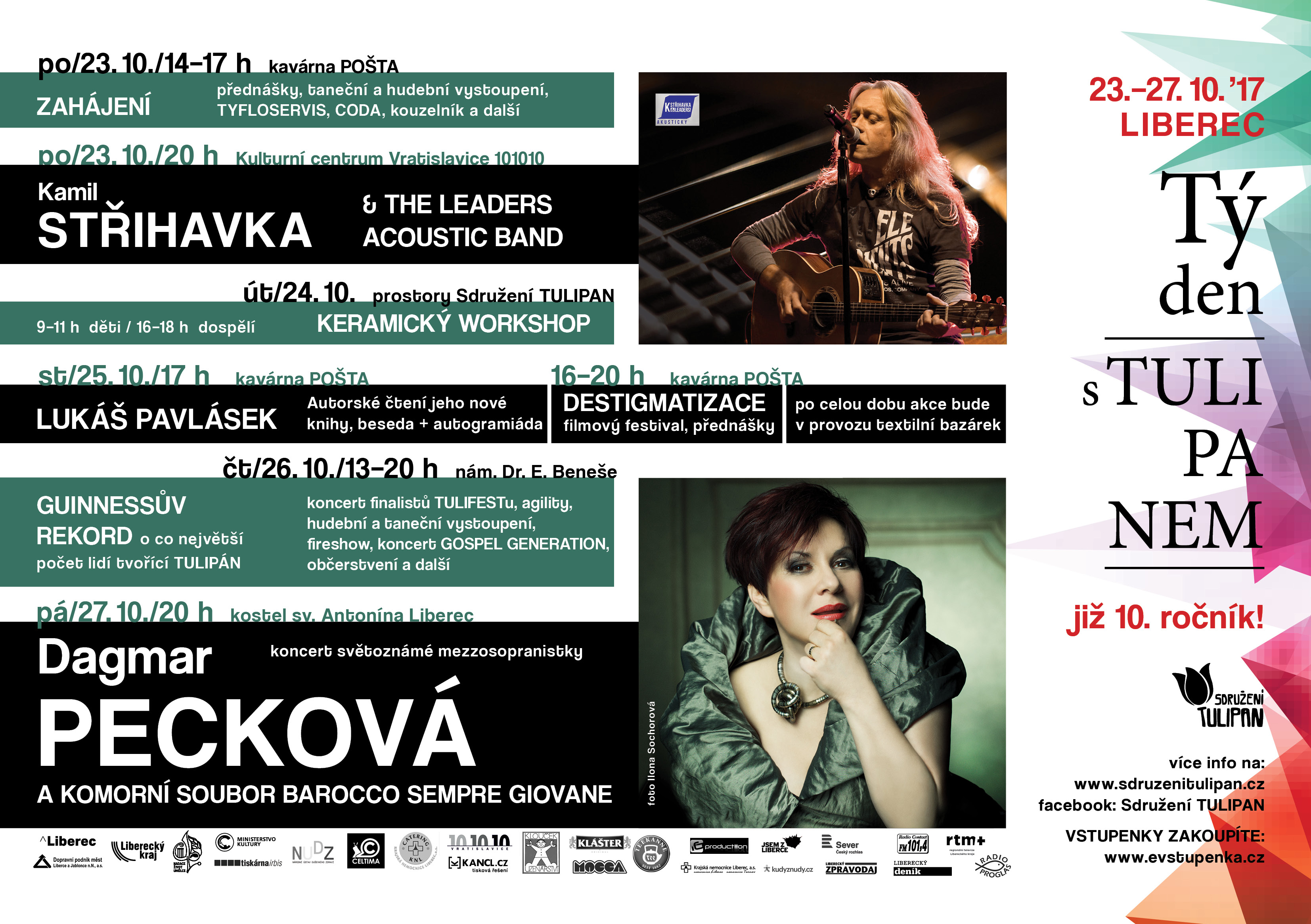 Srdečně Vás zveme na 10. ročník kulturní akce ?"Týden s TULIPANEM". Akce se bude konat v termínu 23.-27.10. 2017. I letos se budeme snažit obohatit ponuré podzimní dny příjemnými zážitky po celý týden. Celou akci zahájíme v pondělí 23.10. v legendární liberecké kavárně POŠTA a večer potom akustickým koncertem Kamila Střihavky & The Leaders acoustic band v Kulturním centru Vratislavice 101010.