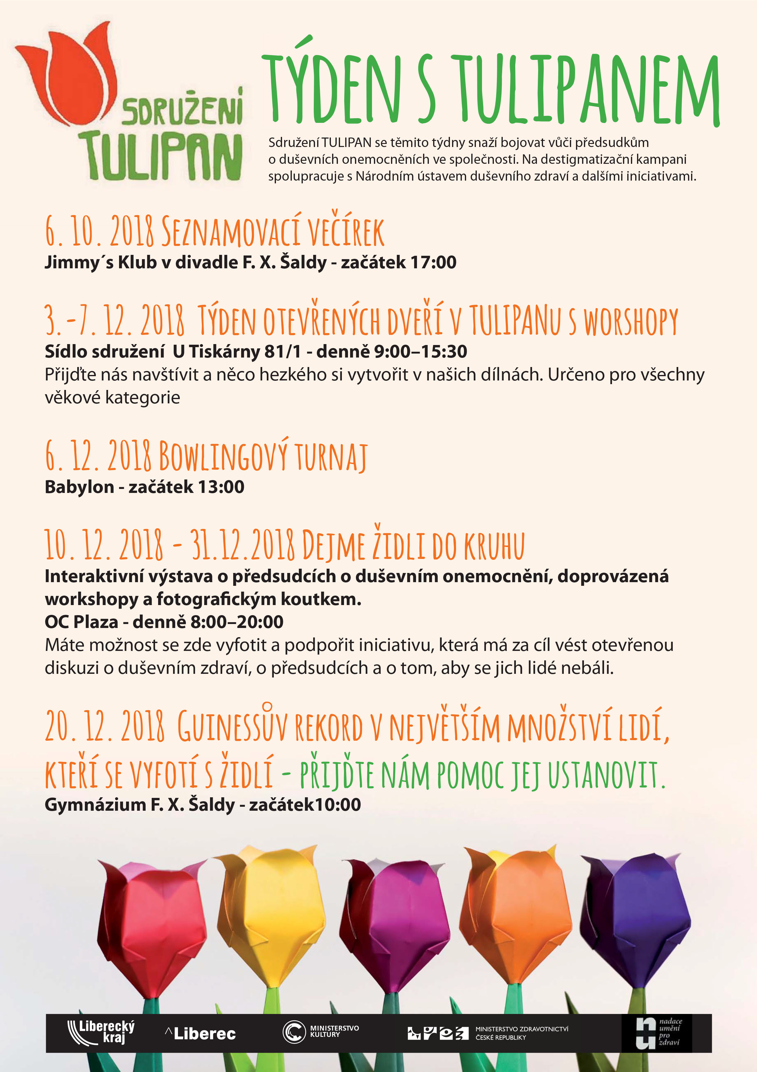 Sdružení TULIPAN se těmito týdny snaží bojovat vůči předsudkům o duševních onemocněních ve společnosti. Na destigmatizační kampani spolupracuje s Národním ústavem duševního udraví a dalšími iniciativami. Program Týdne s TULIPANem vlevo. |
